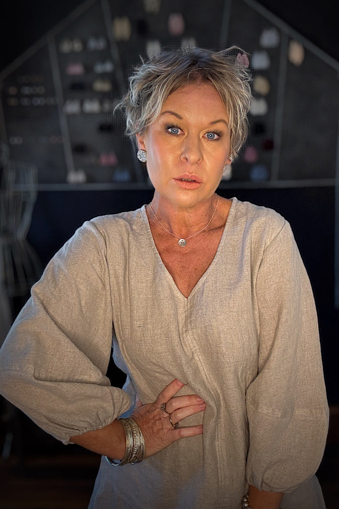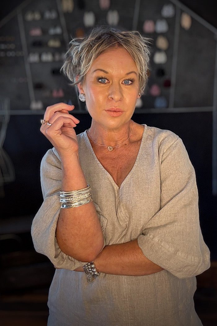 Crafted from breathable European linen and lightly lined with cotton, it feels soft on the skin and airy in warmer weather. A structured V neckline and balloon sleeves create a flattering shape, while deep side pockets add a practical touch.