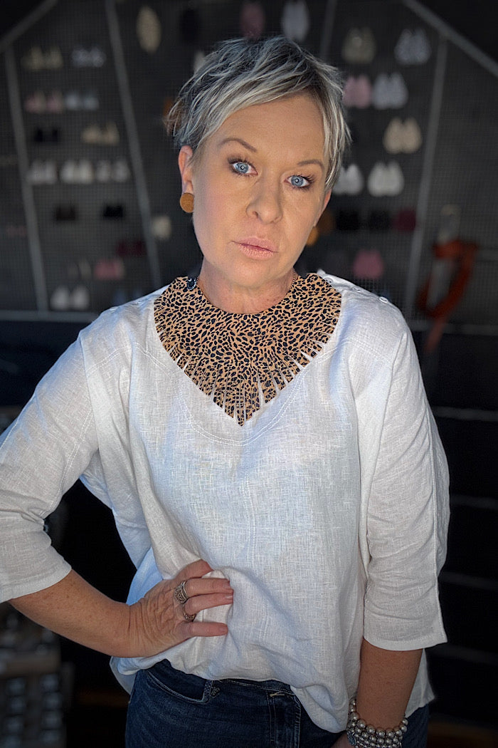 To complete your look we recommend a pair of our hand crafted Leather & Steel Studs. Our Mocha Linen Colourway looks amazing paired back with our Cinnamon Suede Stud Earrings. To view our Stud Earring Collection click here.