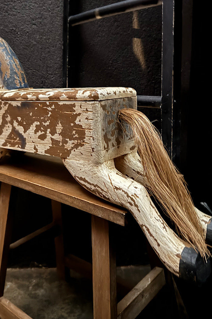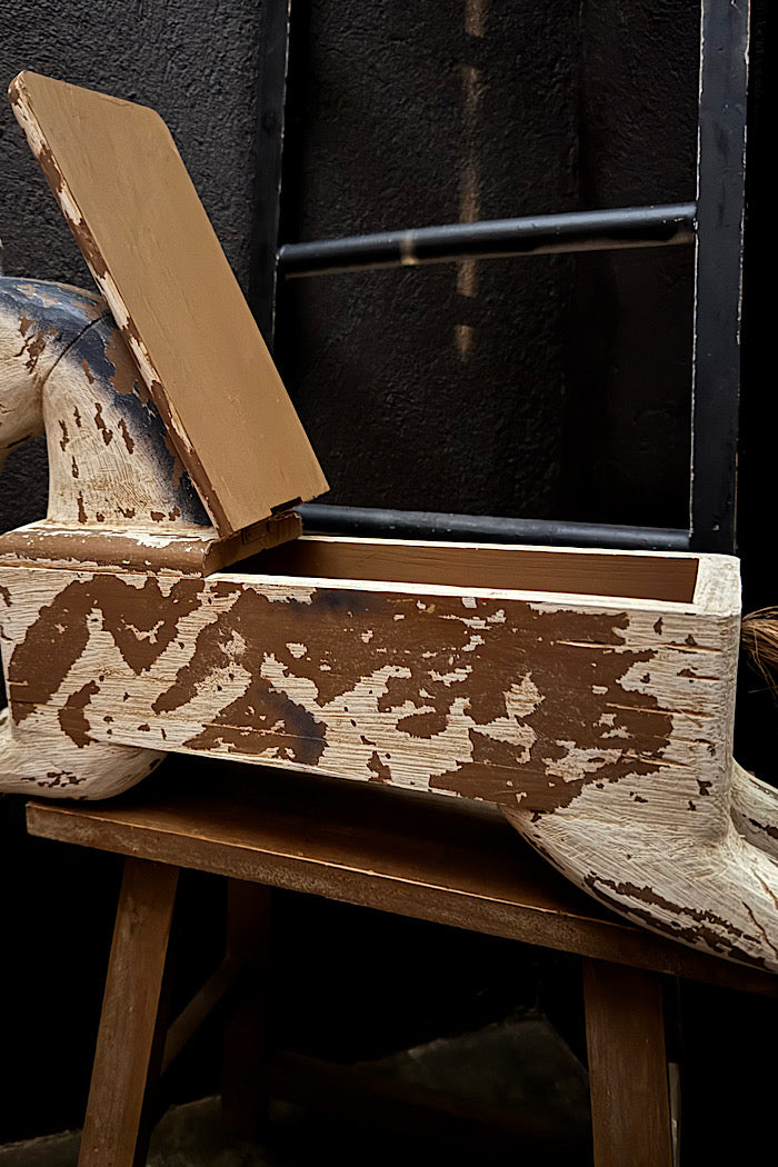 Vintage crafted this horse has a story to tell and a hidden panel to store your treasures.