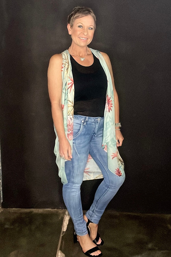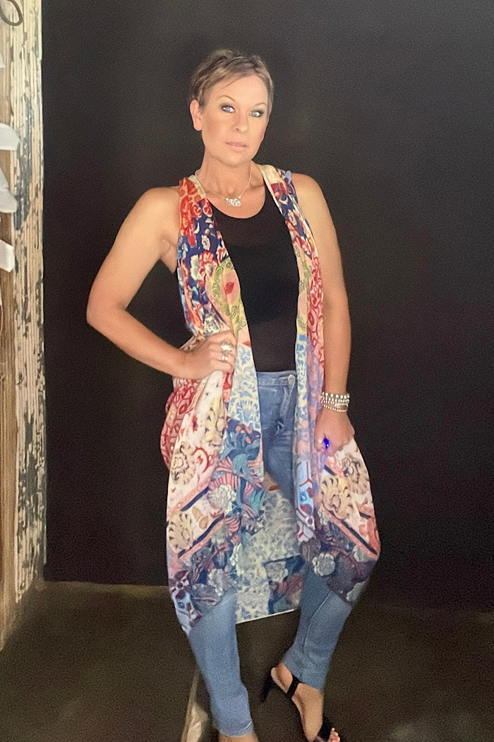 The versatility of this beautiful accessory is endless as it can be worn as a sleeveless cardi, tied and tucked to create a vest like top with a longer style back for bottom coverage, tied and left loose over swimwear so we feel not so exposed, tied behind the back to create a cape without to much volume or wrapped and threaded to create a statement scarf.
