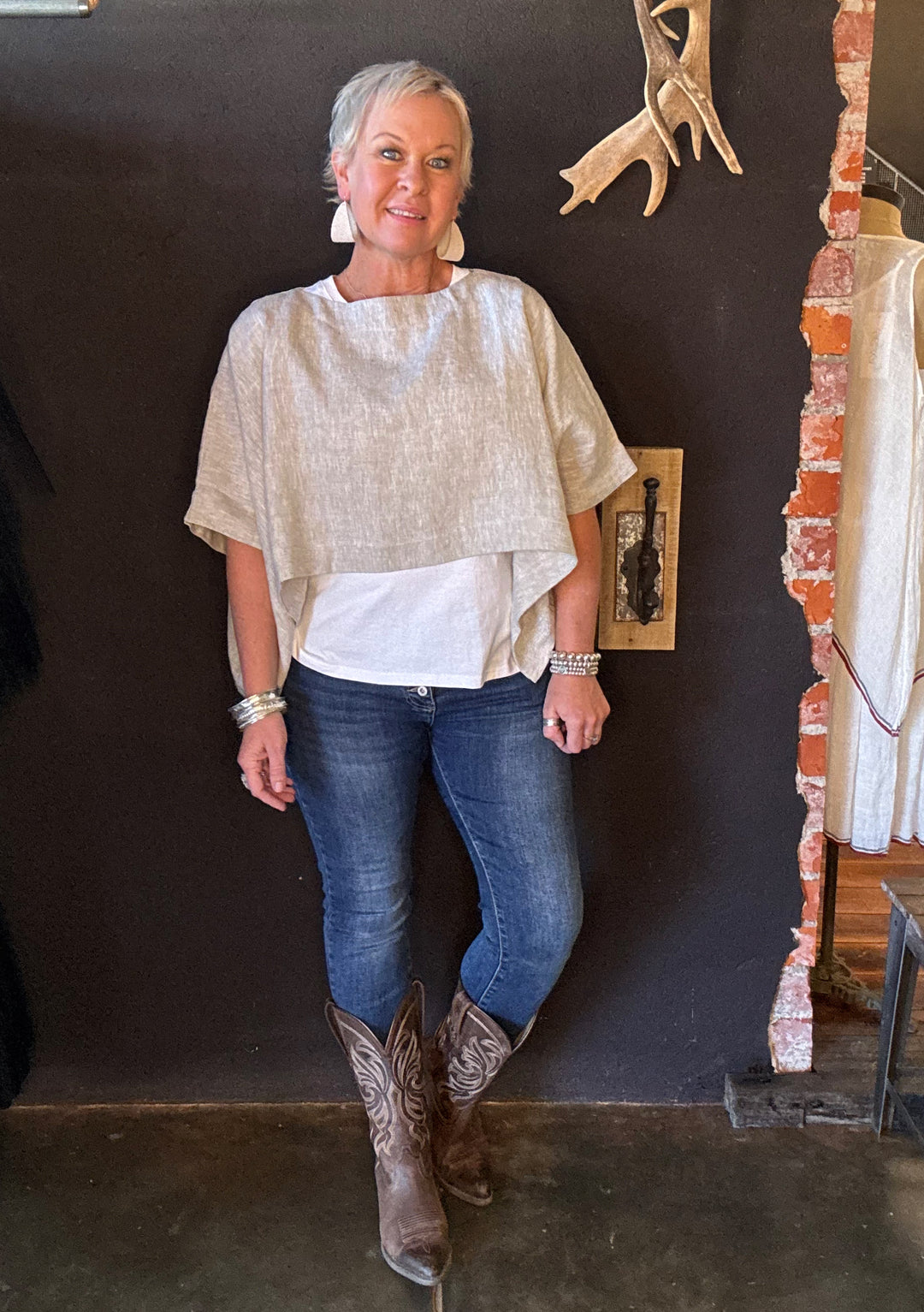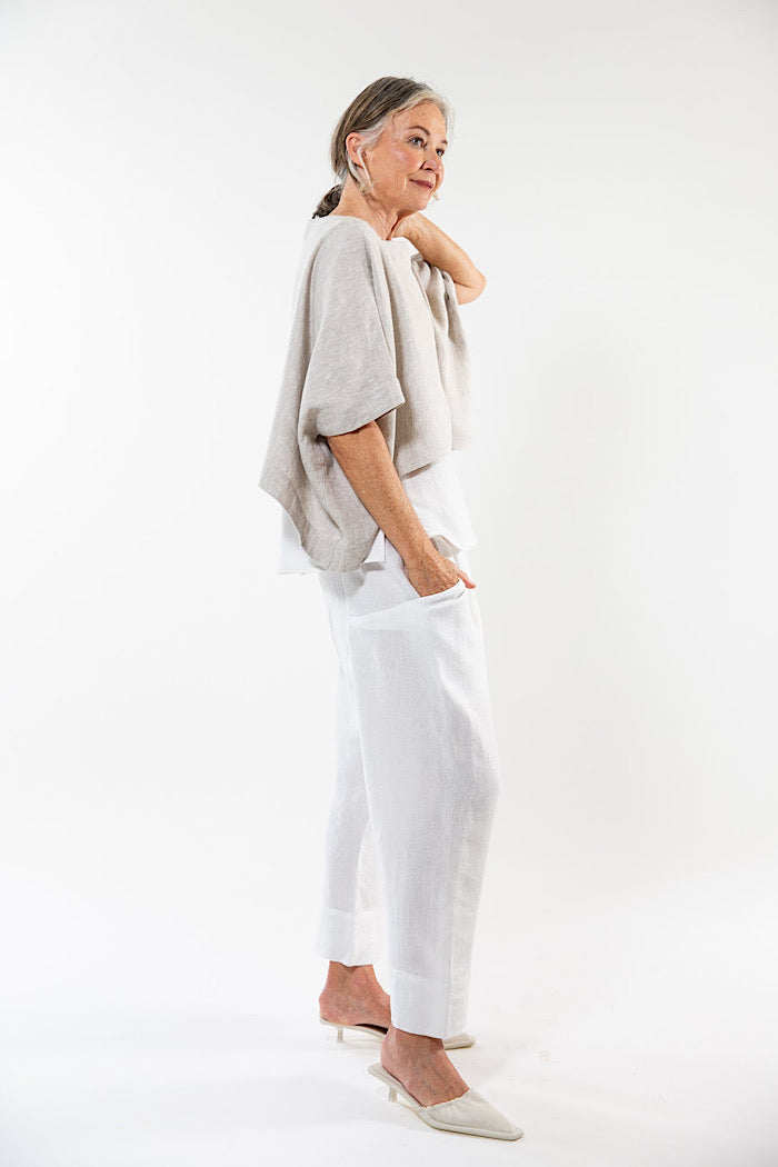 The Essentials Collection Tommy Top in Neutral is a versatile, cropped-length, layering garment. It has an elegant boat neckline, dropped shoulders that become the sleeves, and a wide boxy shape through the body. The front hemline is shaped, and all edges of this garment feature a lovely wide facing, adding to the quality feel of this garment.
