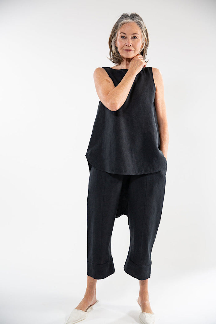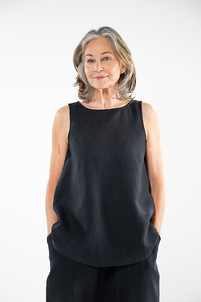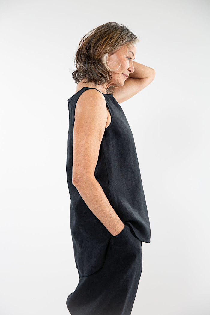 The Essentials Collection Winnie Top in Black is an elegant tank-style sleeveless top - perfect under a jacket or as a base layer garment. It has a shallow neckline and subtle a-line shaping through the body. The front and back hemlines are curved, and the back hemline is dropped.